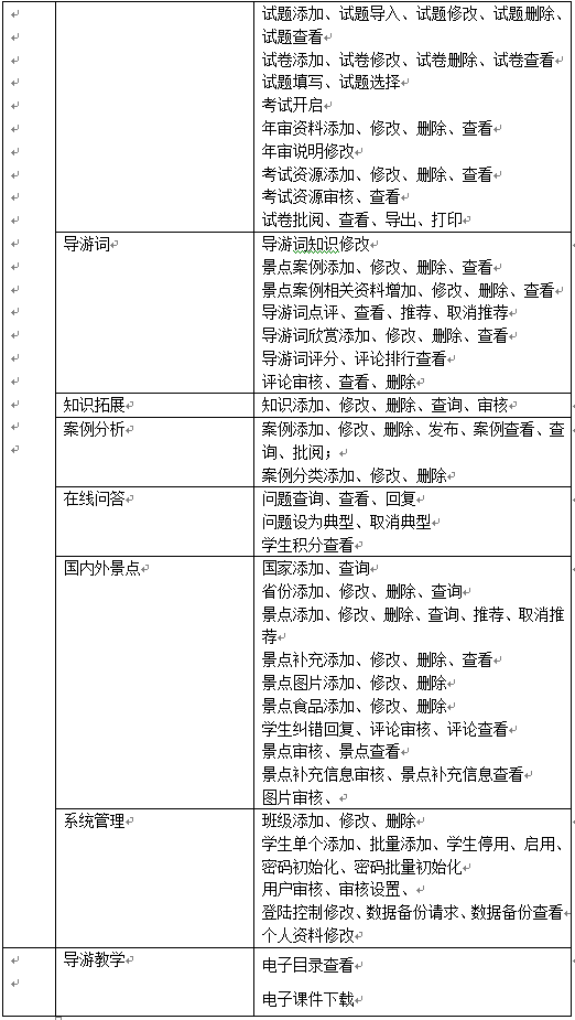 教(jiao)師主要功(gong)能包括班(ban)級學(xue)生(sheng)管(guan)(guan)(guan)理(li)(li)(li)(li)、導游(you)基礎(chu)知(zhi)識管(guan)(guan)(guan)理(li)(li)(li)(li)、國內導游(you)知(zhi)識管(guan)(guan)(guan)理(li)(li)(li)(li)、國外(wai)導游(you)知(zhi)識管(guan)(guan)(guan)理(li)(li)(li)(li)、情(qing)景(jing)題目管(guan)(guan)(guan)理(li)(li)(li)(li)、導游(you)證考試(shi)資料管(guan)(guan)(guan)理(li)(li)(li)(li)、模擬考試(shi)、導游(you)詞(ci)管(guan)(guan)(guan)理(li)(li)(li)(li)、導游(you)案(an)例管(guan)(guan)(guan)理(li)(li)(li)(li)、知(zhi)識拓展、案(an)例分析(xi)管(guan)(guan)(guan)理(li)(li)(li)(li)、在線問答(da)、國內外(wai)景(jing)點信息管(guan)(guan)(guan)理(li)(li)(li)(li)等。