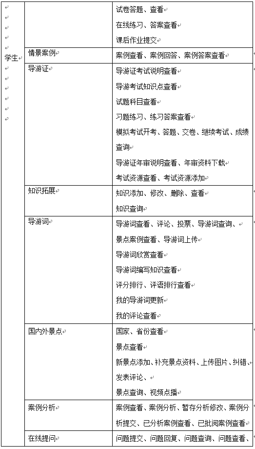 學(xue)(xue)生的(de)主要功能是導游(you)教學(xue)(xue)知識(shi)的(de)學(xue)(xue)習(xi)、完成(cheng)情景(jing)推理中包含的(de)案例及題目、導游(you)證考(kao)試學(xue)(xue)習(xi)及模擬考(kao)試、導游(you)拓(tuo)展知識(shi)學(xue)(xue)習(xi),同(tong)時可添加(jia)新的(de)知識(shi)供其他(ta)同(tong)學(xue)(xue)學(xue)(xue)習(xi)、導游(you)詞(ci)學(xue)(xue)習(xi)并編(bian)寫導游(you)詞(ci)、國內外景(jing)點學(xue)(xue)習(xi)、案例分析和在線提問。